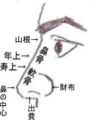 ![]() 鼻は、金運と自分自身を示します。鼻には現在の運気がでます。 〔山根〕 額の骨と鼻の骨が接する場所です 眉間近くの下にある 鼻筋を触ると段がついています ここが鼻のスタート=山根です 鼻を顔の中の山にたとえて、この場所を山根といいます。疾厄宮とか志の宮とかいいます。 ヨーロッパ人と日本人で山根の位置が少し違います ヨーロッパ人は眉間のすぐ下にありますが 蒙古系の日本人は上まぶたが広いので 目頭と目頭の間より少し上にあるのが多いです ![]() 〔右身 左身〕 鼻筋の横で斜めになっている鼻の部分ですが 右側の斜めが右身 左側の斜めが左身です 〔鼻筋横=右身 左身〕は 2通りの見かたがあります。 1. 眉間から鼻筋に沿って鼻穴の上へ直線で気色が通じると雇われている立場の収入があります。 気色線は左絵の眉間から鼻骨軟骨と書いてある場所を直線で通り鼻先に至ります 2. ホホから鼻の寿上を通り鼻先に気色が入ると自営業などのかたの売上げ収入です 〔鼻先〕 鼻の中心はここ。準頭といいます。 魔女の絵のように鼻先が長いとしつこいというか執念深い 〔小鼻〕 金庫ともいいます。鼻穴から小鼻をみるのがコツ。小鼻の肉付きがよくわかります。肉厚は金運あり。やせ肉は貧乏中です。 ホホが世間。鼻筋が自分です。 〔鼻の穴〕 お金が出て行く場所 |