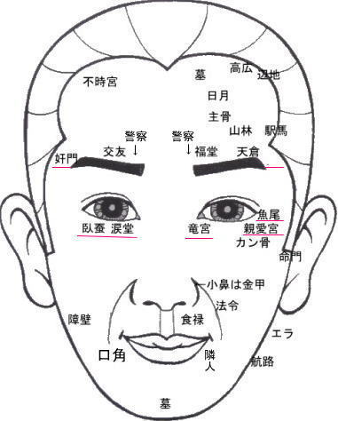 | 福堂(ふくどう)=眉頭 | 交際運と心の喜び。金運。 福は心の喜び。富はお金がいっぱい。福堂はお金よりも心の方に重心を置いて考えた方がよい |