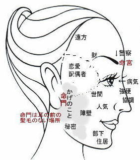 耳の前に命門があります。大事な神経の束があるところで、命の門というくらいですから、健康に関係あります。 命門で親戚や深い仲の恋人のことを見ることもあります。 眉間は命宮です。紛らわしいですが、門というのは、出入り口のことです。宮というのは、居場所のことです。 |
