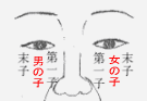 人中で子供を数える方法です。 溝の真ん中の第1子、溝の右淵を第2子、溝の左淵を第3子、に当てはめます。 子どもが2人だけですと、溝の中と淵だけです。 子どもが5人ですと、3・4・5と順番に当てはめます。 ※父親の人のことは見たことがないのでわかりません。 |