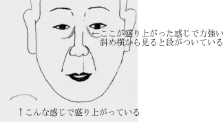 額に日角月角があります。実親に対する自分の気持ちが出ます。←色ツヤででます では、実親や義親はどこに画相がでるでしょうか。←画相は念で念で出ます 自分がこれらの親を“自分より目上”と思っていると目上の場所=額にでます。 額のどこに出るかはいろいろです。 “自分より目下”と思っていると目から下に出ます。 |
