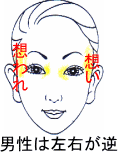 1. 顔占いでは道徳・倫理・同性愛は問いません。 露見の結果、社会的不都合が生じる場合は、進路上の問題として額に悪色が出ます。 2.夫婦か同棲か見分けられません。 3.「本妻のほうはダイヤでない指輪」と、川柳にありますが、二人の人を同時に恋することはできません。 昔の人相の本は倫理を持ち込んだので、難解になりました。 「想う」「想われる」と、ふたつに分けると簡単です。 機械にたとえると、想いの場所は発信機、想われの場所は受信機と覚えてください。 |