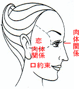 ① 恋の画相は、上から下へ場所を動く傾向があります。例えば、こめかみの生え際あたりにあった画相が、最近、目の横に移動してきた場合。 ←遠くから見ていたのが身近に来ました。 頬骨は世間を示します。 恋を世間が認める、というか、結納や結婚が近づいていると、目尻の下で頬骨の横に画相が出ることも多いです。(親愛宮) ただ、結婚は進路上のことなので希望線の有無を見ます。画相が消えるのが近い(恋が消える)場合もあります。 【ヒモになってる場合】眉尻あたりは恋の初期、または まだキスもしていない状態の場所です。 体の関係があるのに眉尻(お金の場所)に画相があるとすればSEXとお金をあてにされています 恋の画相は上から下へ移動します 1.右眉尻に彼の画相がある場合 まだキスもしていない初期 3.そろそろ飽がれると親愛宮(友達以上恋人未満) といって目尻の下の頬骨に移動 日本の夫婦のほとんどに目尻の画相はないです あるとすれば 新婚さんとか 離婚絡みとか ② 恋の画相は髪側 (精神的) から 目尻側 (肉体的)へ 画相が目尻にくっつく感じになると体にのぼせています ③ 同居でないが内縁関係みたいになると 耳の前で毛のないところ(命門) に移動していることもあります |