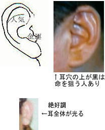 ![]() 耳の前の突起(風当) は予知のポイントです。結果が出る少し前に吉凶がわかります 風当(耳弦ともいいます)は、耳穴の前についている小さい突起です。 【参考】 テニスなど個人試合のとき、風当の白いほうが勝ちます。試合前はよく見ないと白が分かりにくいですが試合中勝ちが近づくにつれ白が増します。勝った瞬間白く光ります。バレーの試合はメンバーの皆の風当がだんだん白くなったチームが勝ちます。 風当とその周りの色が悪いと 運が滞っているときです。 ![]() 実例 2018,年 成人式の着物を売ったり貸したりする契約しお金を受け取り雲隠れした社長がいます テレビでお詫びする羽目になりましたが 彼の風当は右も左も青黒かったので 記者会見したくなかったのでしょう 写真は別人ですが 風当のの場所はよくわかります 。 |