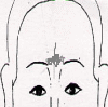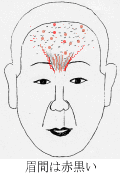 眉間の茶色気色線が右眉頭側にあると原因は人のせいです。左眉頭側にあると自分が原因です。 この写真で茶色は右側ですから、不快の原因は人のせいです。 |